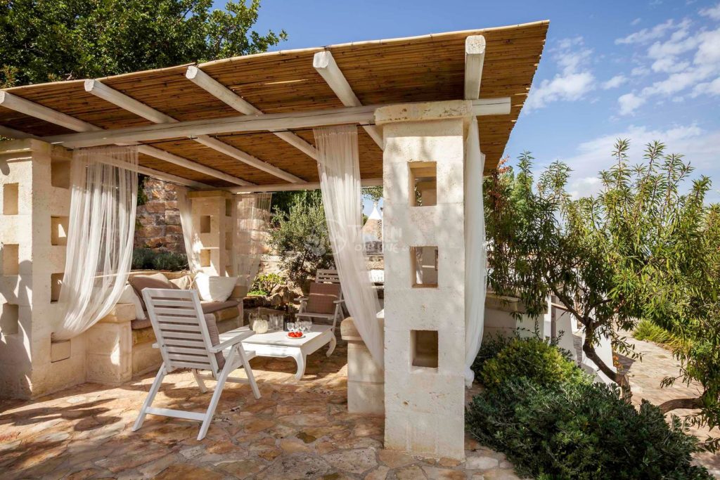 The trullo, built in 1861 only with stones cut by hand and laid dry by the masters trullari (the craftmen of that century), offers today a living area of 105 sqm. It can easily accommodate 6 people and opens onto a large piazzale (yard) of 150 sqm paved with ancient "chianche" facing the Adriatic Sea. To its right, the long blue rectangle of the 15 m pool.