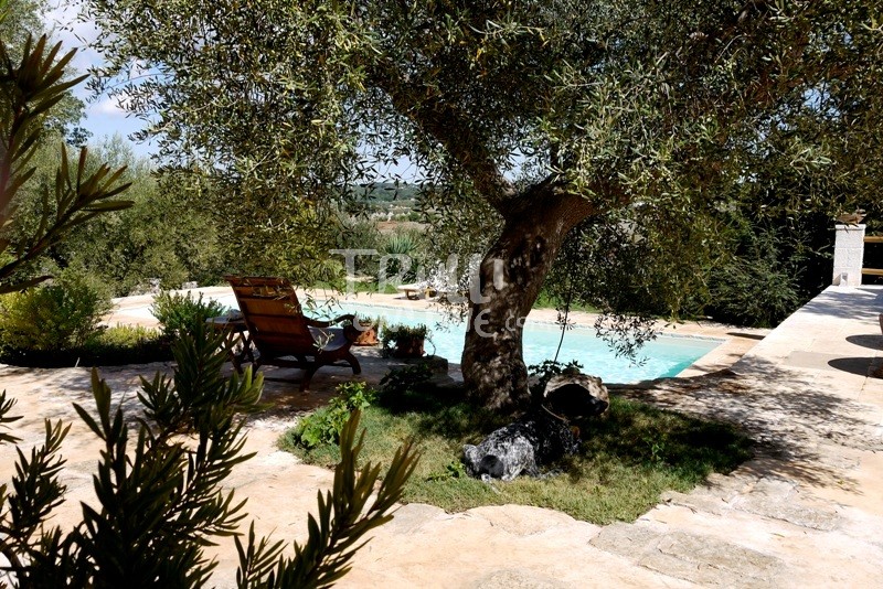 From the parking lot, along a narrow path, you reach the Trulli and the main entrance of the house where you will find the first double bedroom furnished with a white wrought iron double-bed and bedside tables, two closets and large wooden Balinese drawers. The roof of the room has the typical cone shape with exposed wooden beams.